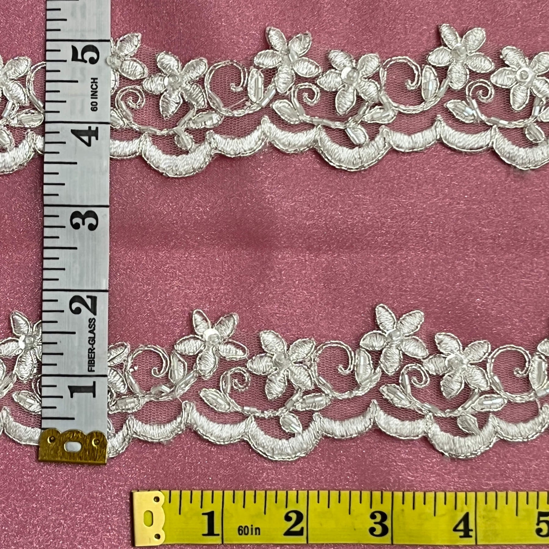 Transform your special occasion dress with this stunning Beaded & Corded Lace Trimming Embroidered on 100% Polyester Net Mesh from Lace USA. These beautiful trimmings are perfect for making that special gown or costume look truly unique. The trims are handmade, giving it an exquisitely luxurious appearance, and they’re available in 1 color to choose from. You can use this high quality trimming to give your bridal gown, evening dress, quinceanera dress, dance costume, or any special occasion dress an extra dash of shimmer and elegance. The lace is made of 100% polyester and measures approximately 1.85" inches in width, so you can be sure that you’ll get the perfect trim for your desired look. Add a unique finishing touch to your design by using these Couture Beaded & Corded lace trims, Decorative Beaded lace trims, and Elegant Beaded & Corded lace trims. With this beaded lace trim from Lace USA, you can make any special occasion gown stand out from the crowd.